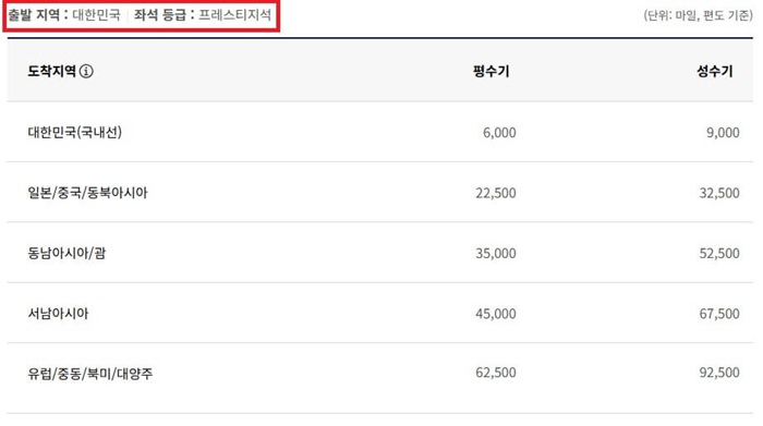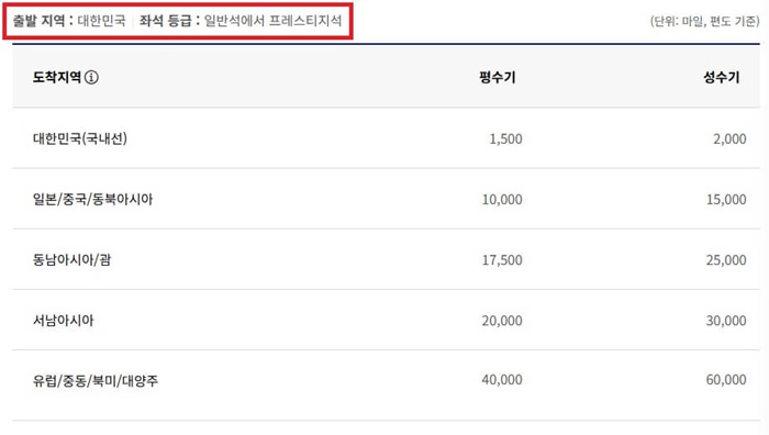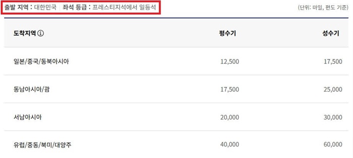 대한항공 마일리지 사용을 위한 항공권 공제표는 출발 지역과 좌석 등급 등에 따라 차등적용 됩니다.