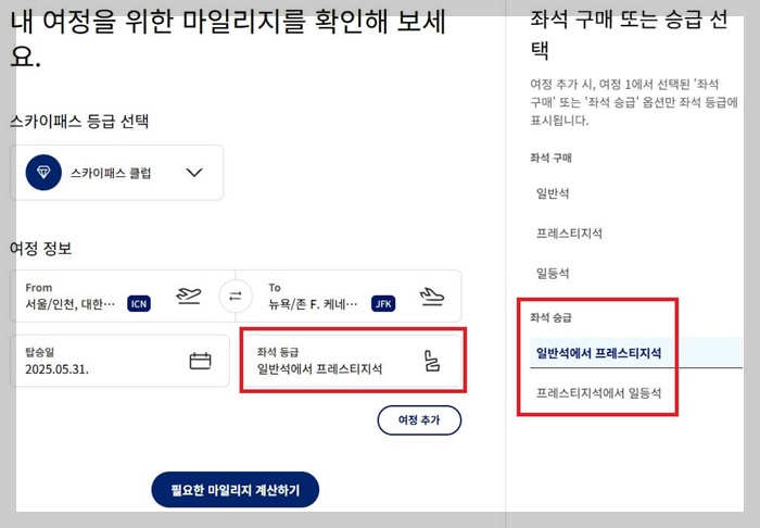 ' 좌석 업그레이드(승급) 계산하기'를 이용하여 원하는 일정과 회원 등급 선택 후 필요한 마일리지 확인이 가능합니다.