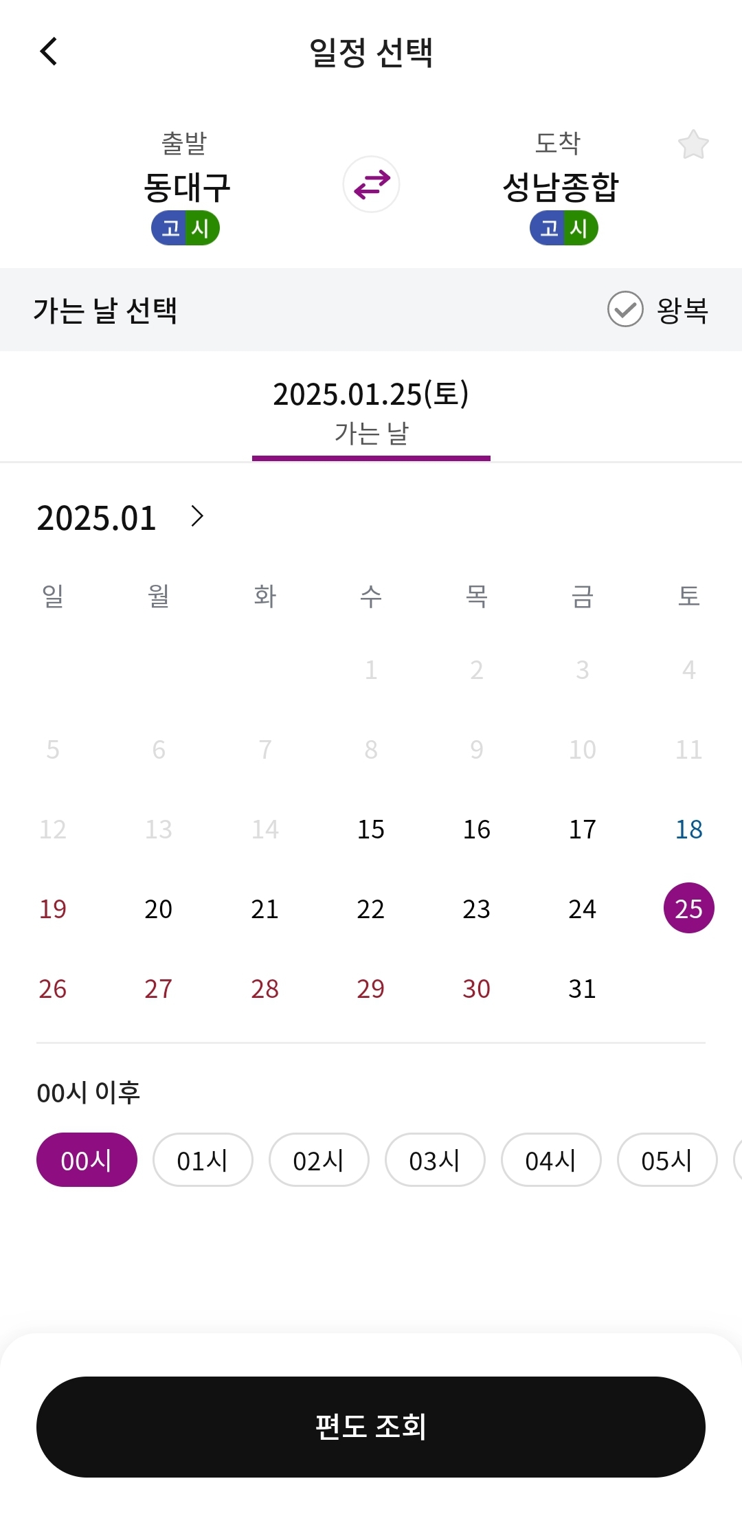 원하는 출발 날짜와 시간을 선택한 후, 화면 하단의 "편도 조회" 버튼을 눌러 검색을 시작합니다.