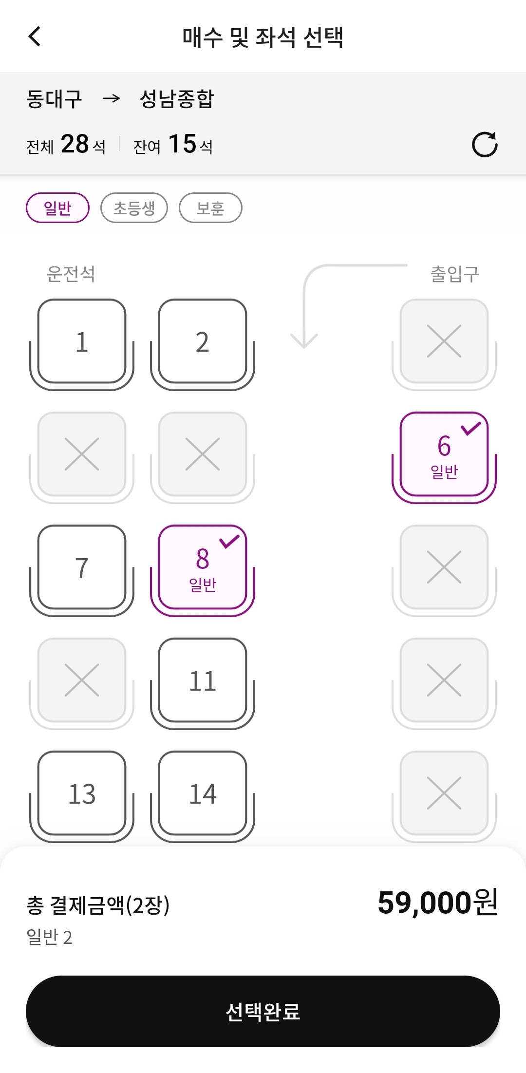 잔여 좌석 중 원하는 좌석을 체크합니다. 화면 하단의 "선택 완료" 버튼을 눌러 예약을 확정합니다.