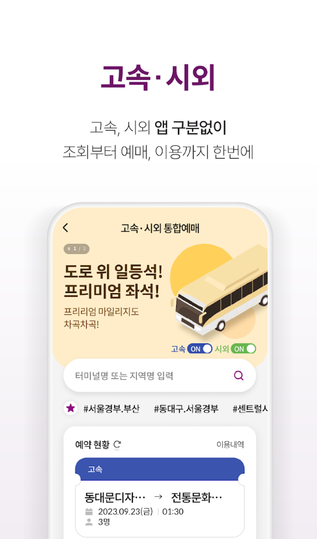 모바일 예매는 매우 간편하게 할 수 있습니다. 동대구시외버스터미널의 버스 예매를 휴대폰으로 빠르게 자리를 미리 자리를 선점해세요.