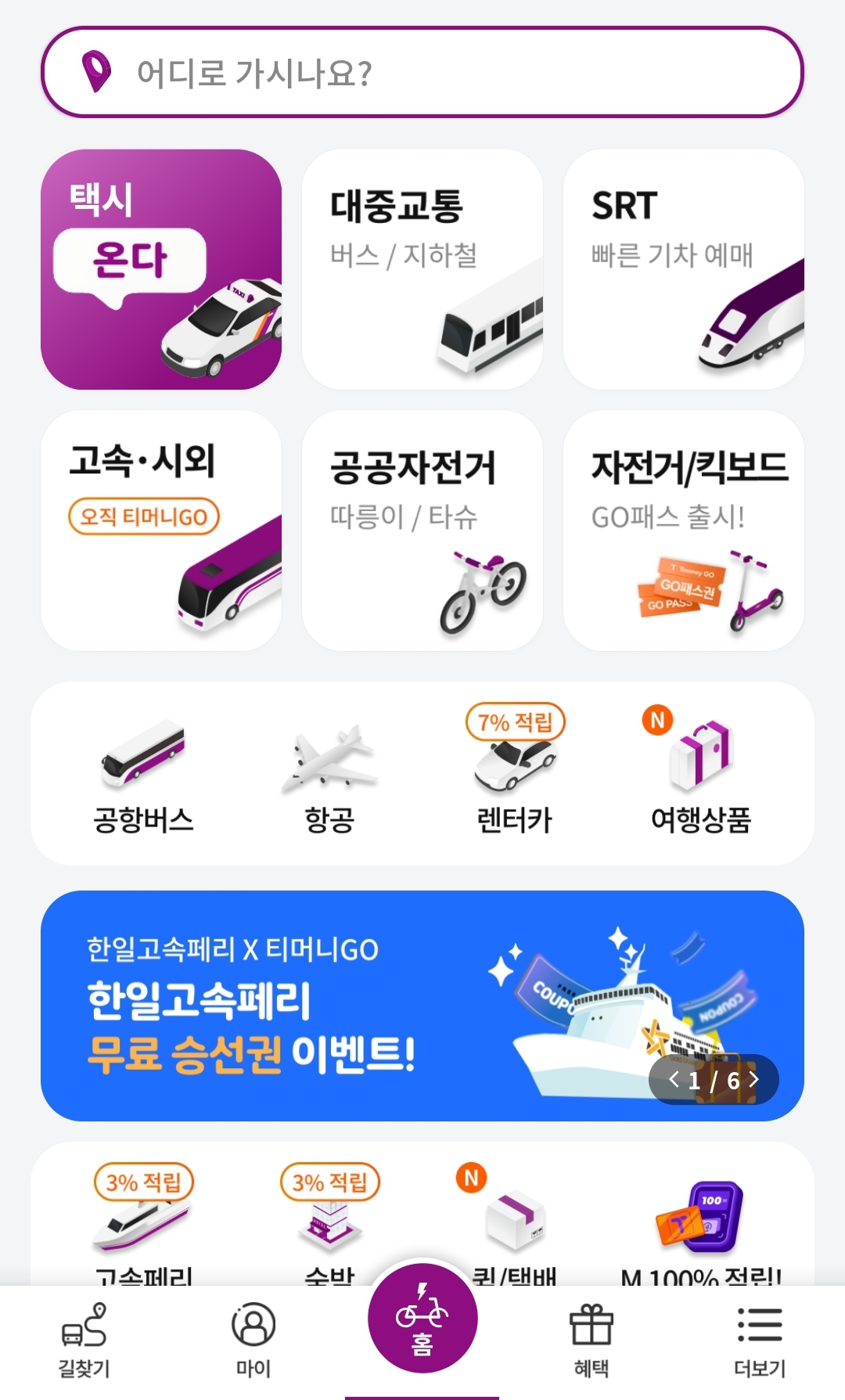 앱을 실행한 후, 홈 화면에서 고속.시외를 선택하여 시외버스 예매 화면으로 이동합니다.