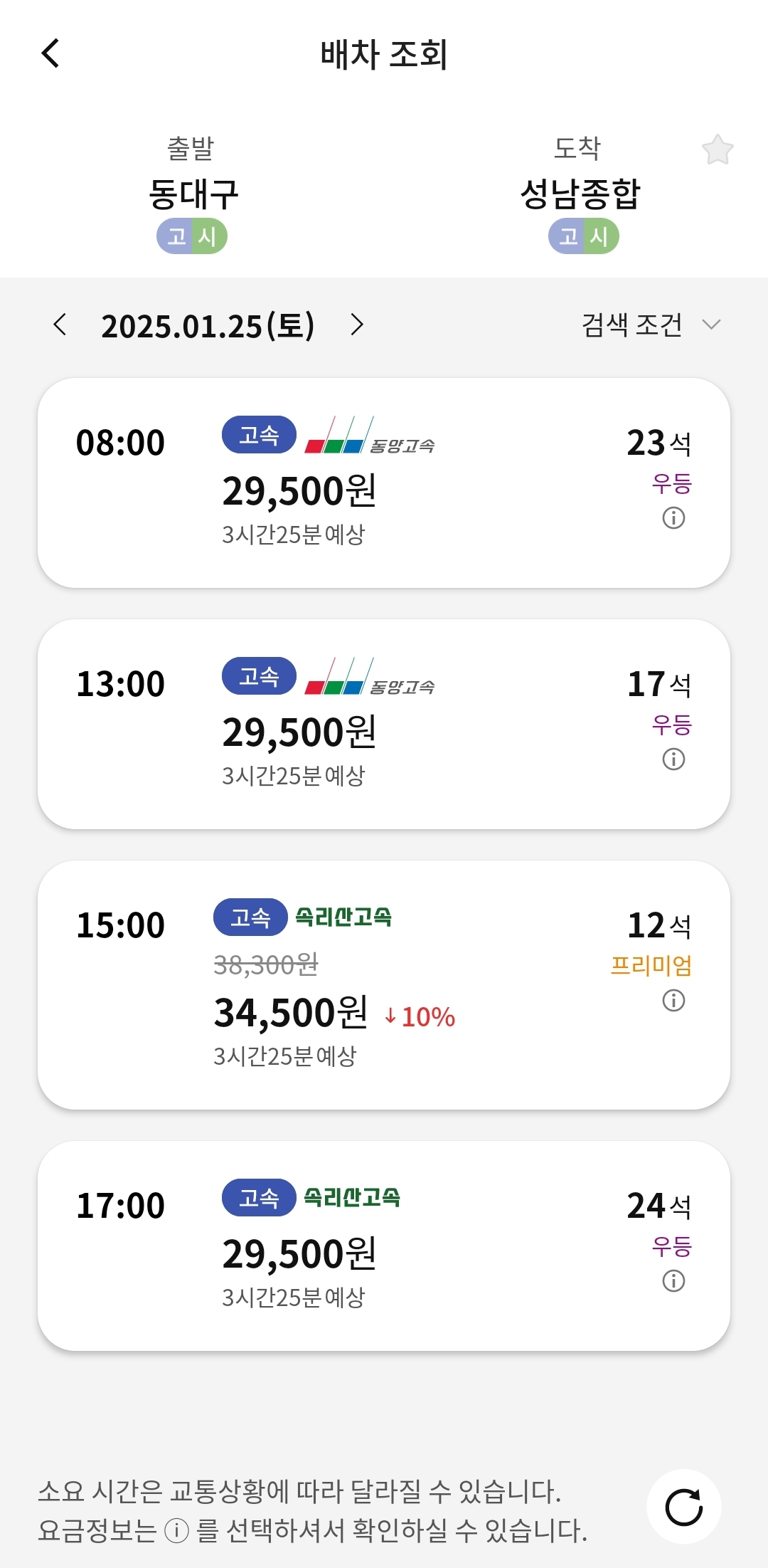※ 버스 등급 별 요금이 다르므로, 선호 등급을 잘 확인해 주세요. 일반석, 우등석, 특석 등 선택할 수 있습니다.